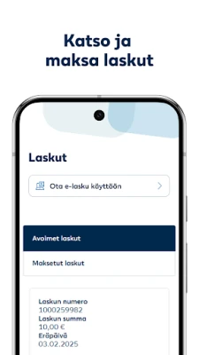 Arjen taloudenhoidosta tulee vaivattomampaa sovelluksen avulla. Voit kätevästi tarkastella erääntyviä laskujasi, ottaa käyttöön paperittoman palvelun tai siirtyä e-laskuun, varmistaen, ettei yksikään eräpäivä pääse unohtumaan. Yhteydenpito LähiTapiolaan on niin ikään tehty äärimmäisen helpoksi: lähetä viestejä, löydä nopeasti asiakaspalvelun yhteystiedot tai varaa aika asiantuntijan juttusille. Älä myöskään jää paitsi vaihtuvista eduista ja ajankohtaisista artikkeleista, jotka tarjoavat tietoa ja tukea taloutesi tueksi. Ensimmäisellä käyttökerralla palveluun tunnistautuminen tapahtuu verkkopankkitunnuksilla, jonka jälkeen jatkossa pääset sisään kätevästi myös sormenjäljellä. LähiTapiola panostaa jatkuvasti sovelluksen kehitykseen ja toivoo käyttäjien palautetta, jotta voimme tarjota entistäkin parempia kokemuksia.