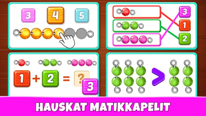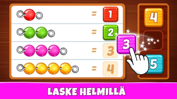 Sovelluksen ytimessä on monipuolinen helmimenetelmä, joka herättää abstraktit numerot eloon konkreettisina esineinä. Lapset voivat tutustua laskemiseen ja perusmatematiikkaan useiden eri minipelitilojen kautta, kuten "Matematiikka helmien kanssa", joka tarjoaa useita haasteita, ja "Helmien laskeminen peräkkäin", joka on ihanteellinen aloittelijoille. Lisäksi tilat kuten "Helmet korissa" ja "Taikahelmet" kehittävät numerotajua sijoittamalla helmiä annettujen numeroiden mukaisesti, kun taas "Kymmenet ja ykköset" sekä "Helmet hauskaa kymmenien ja ykkösten kanssa" opettavat sijoitusarvoja selkeästi. "Määrä Games" -osiossa on runsaasti laskuharjoituksia ja sijoitusarvojen opettelua satoihin asti, sekä yksinkertaisia yhteen- ja vähennyslaskuja. "Trace Numbers" -tila tarjoaa erinomaisen tavan harjoitella numeroiden hahmottamista ja jäljittämistä. Lapset oppivat myös yhteen- ja vähennyslaskua sekä numeroiden vertailua helppojen ja hauskojen harjoitusten kautta.